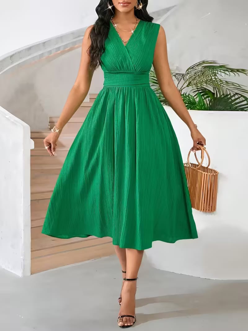 Elegant V-Neck Polyester Dress for Women – All-Season Fitted Solid Color with Fake Buttons and Woven Fabric, 270g/m² – Perfect for Adult